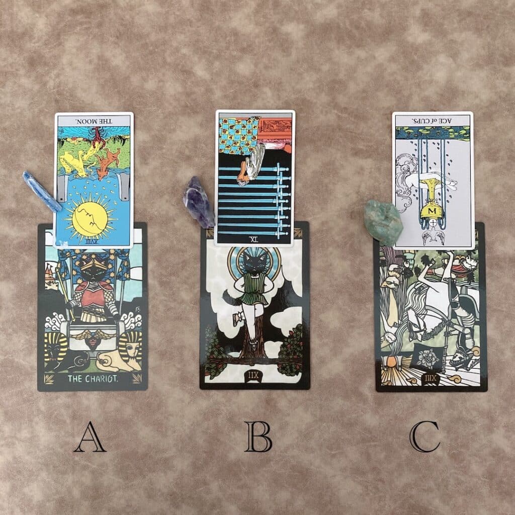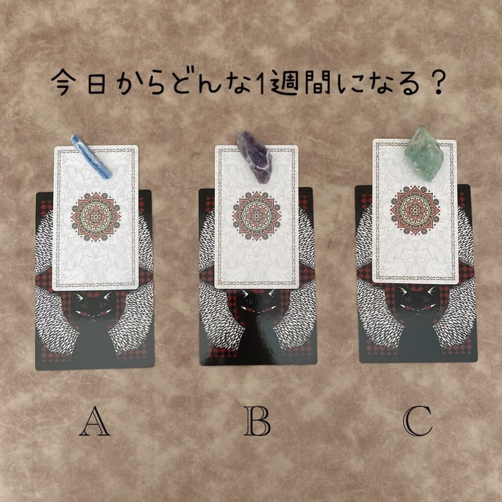 A、B、Cの中から直感で1枚カードを選んでから読み進めてくださいね!今日はそれぞれ2枚引きのリーディングです。